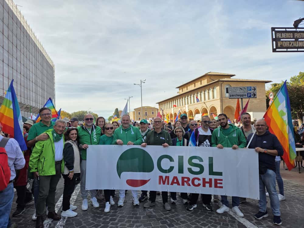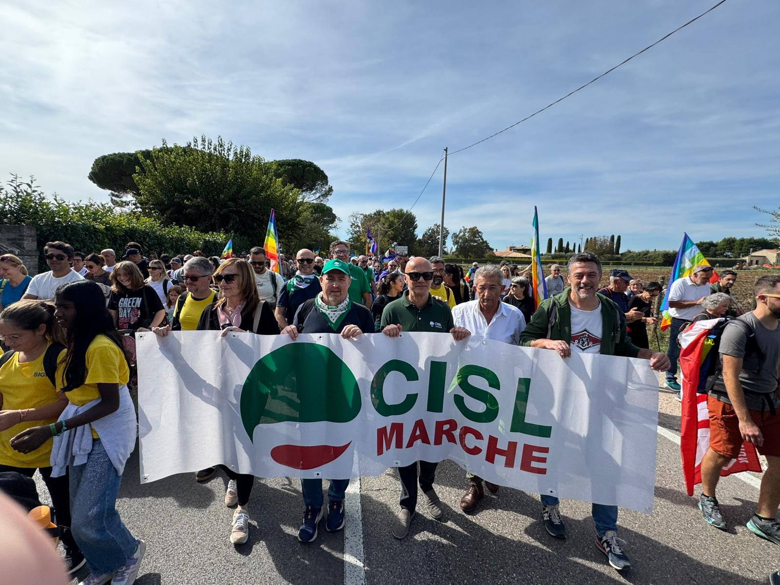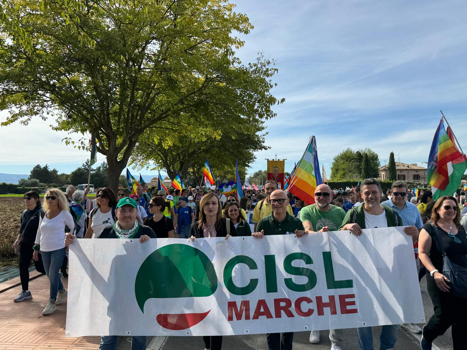 La CISL delle Marche ha partecipato, domenica 12 ottobre 2025, alla Marcia Perugia–Assisi per la Pace e la Fraternità. Un appuntamento che, quest’anno, ha assunto un valore particolarmente significativo, intrecciando alcuni anniversari cruciali della storia recente: gli 80 anni dalla Liberazione, gli 80 anni dalla fondazione delle Nazioni Unite, i 50 anni dell’Atto di Helsinki e i 10 anni dell’enciclica Laudato Sì.