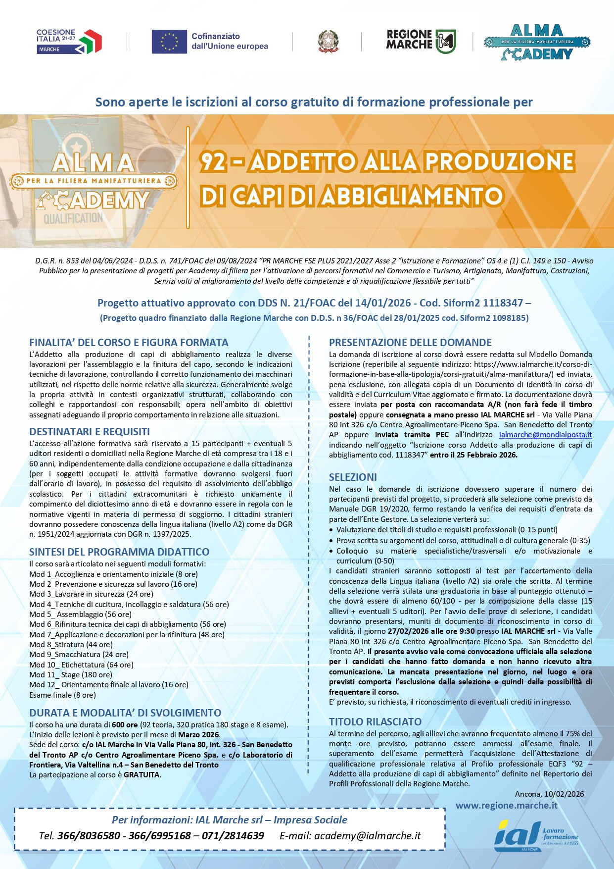Le domande di iscrizione devono essere inviate entro il 25 Febbraio 2026 utilizzando il modulo disponibile sul sito di IAL Marche e allegando documento d’identità e curriculum vitae. In caso di richieste superiori ai posti disponibili, è prevista una selezione basata su titoli, prova scritta e colloquio. Per informazioni è possibile contattare IAL Marche – Impresa Sociale, ente gestore del corso, tramite email o telefono: 366/8036580 – 366/6995168 e-mail: academy@ialmarche.it