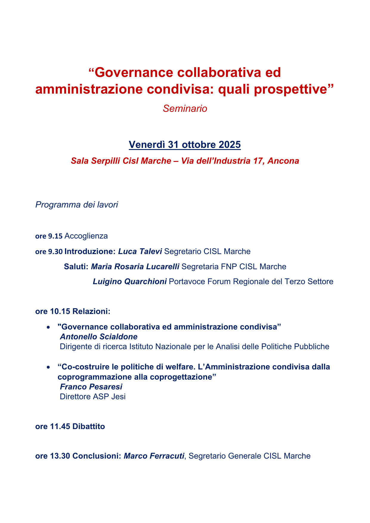 Si è svolto questa mattina, presso la Sala Serpilli della CISL Marche ad Ancona, il seminario “Governance collaborativa e amministrazione condivisa: quali prospettive”, un momento di approfondimento e confronto promosso dalla CISL Marche per analizzare le potenzialità e i limiti degli strumenti di partecipazione attiva introdotti dal Codice del Terzo Settore, valutandone l’applicabilità nel contesto marchigiano, in particolare nell’ambito delle politiche sociali e di welfare.