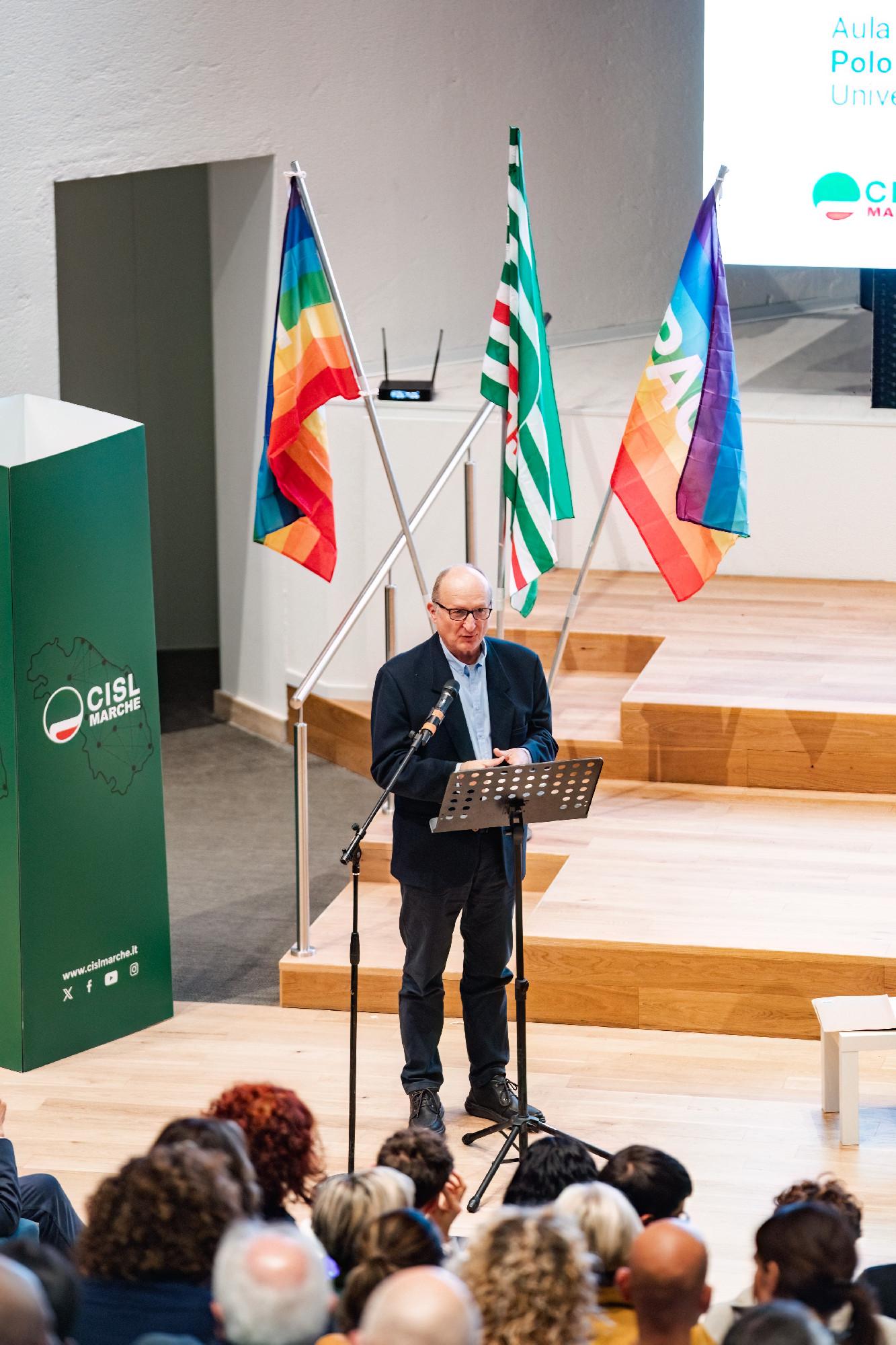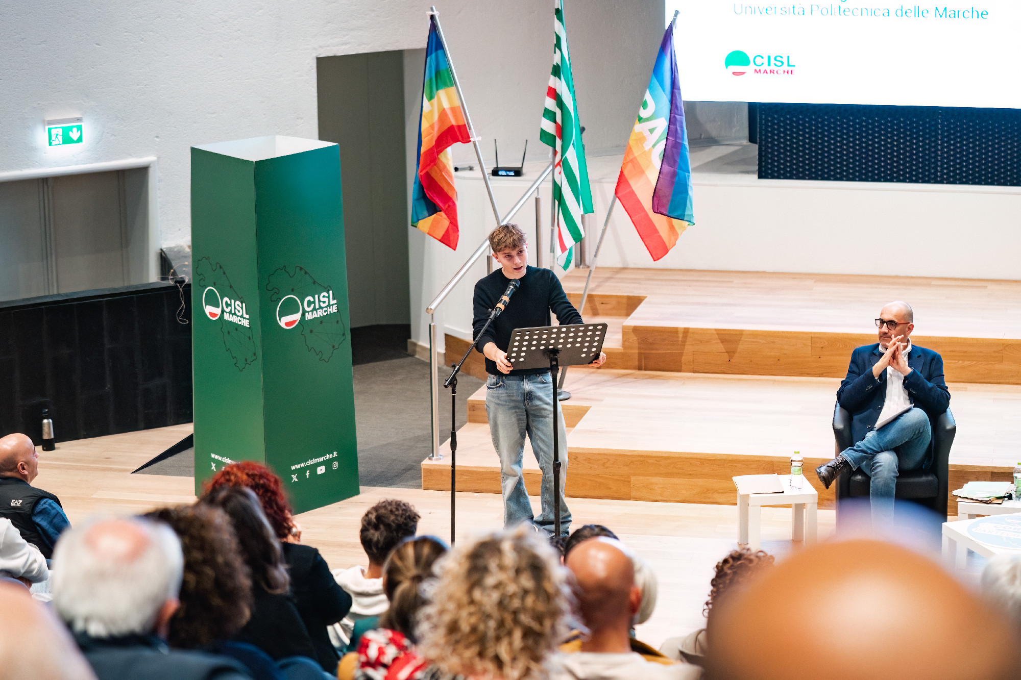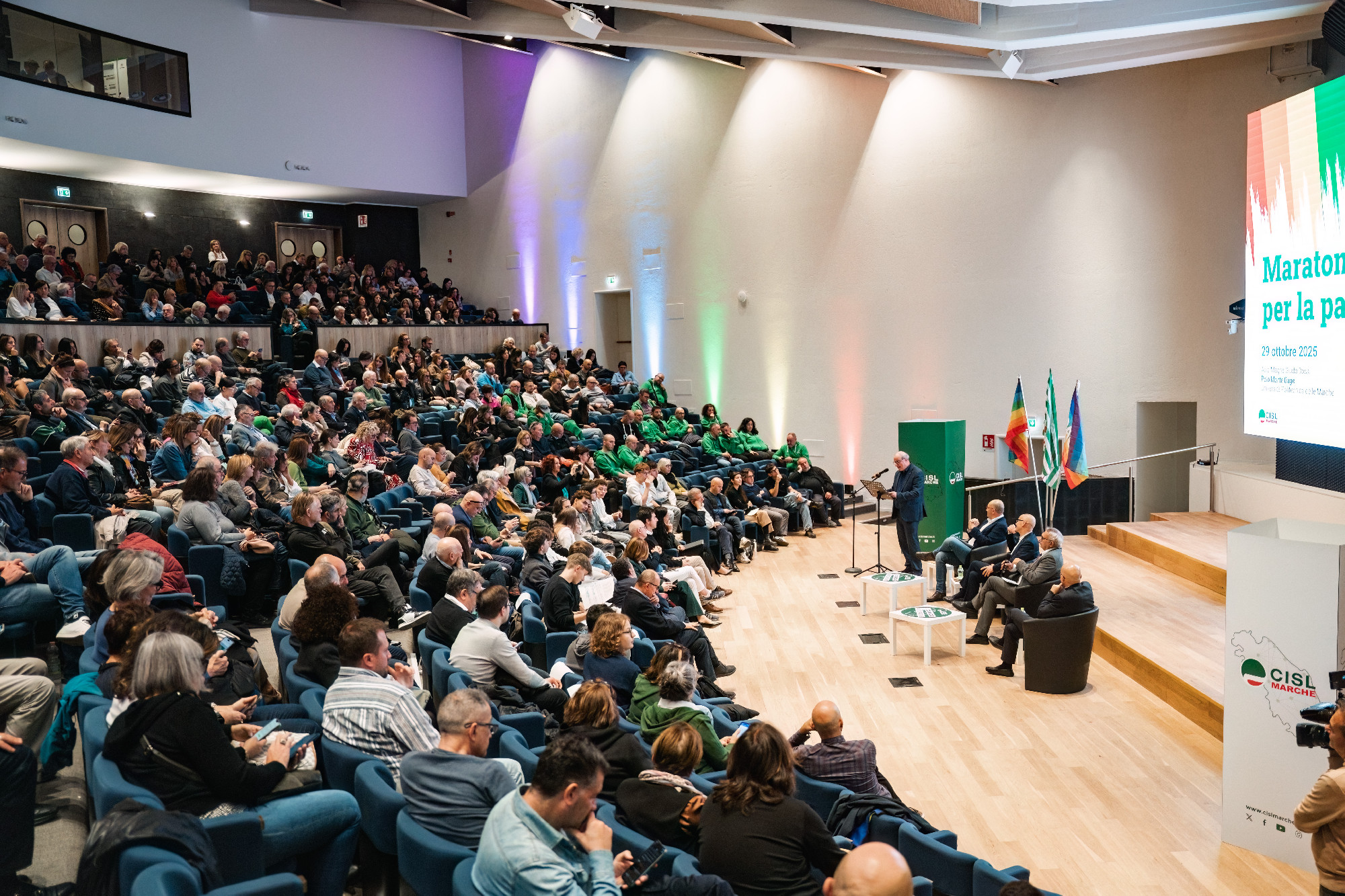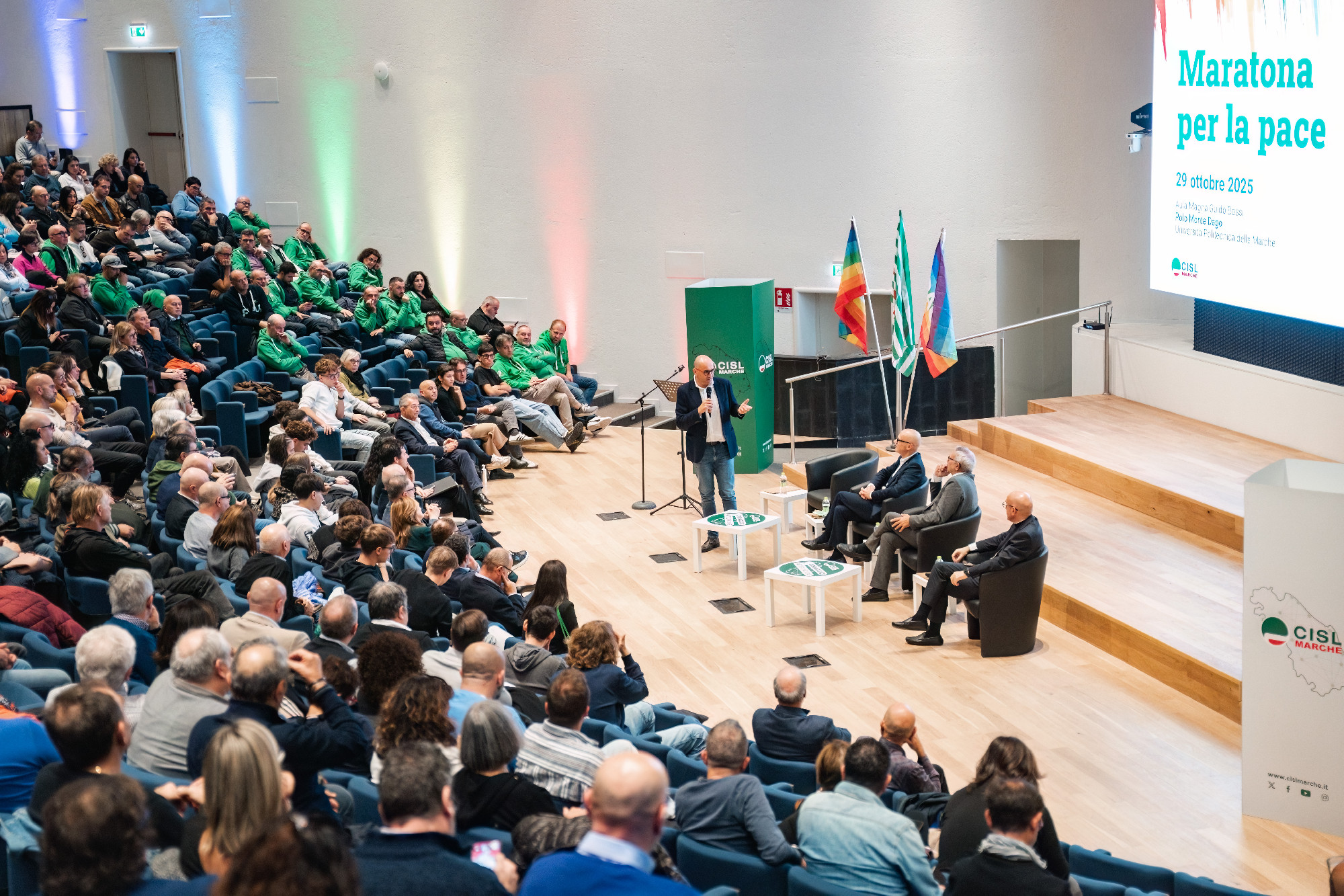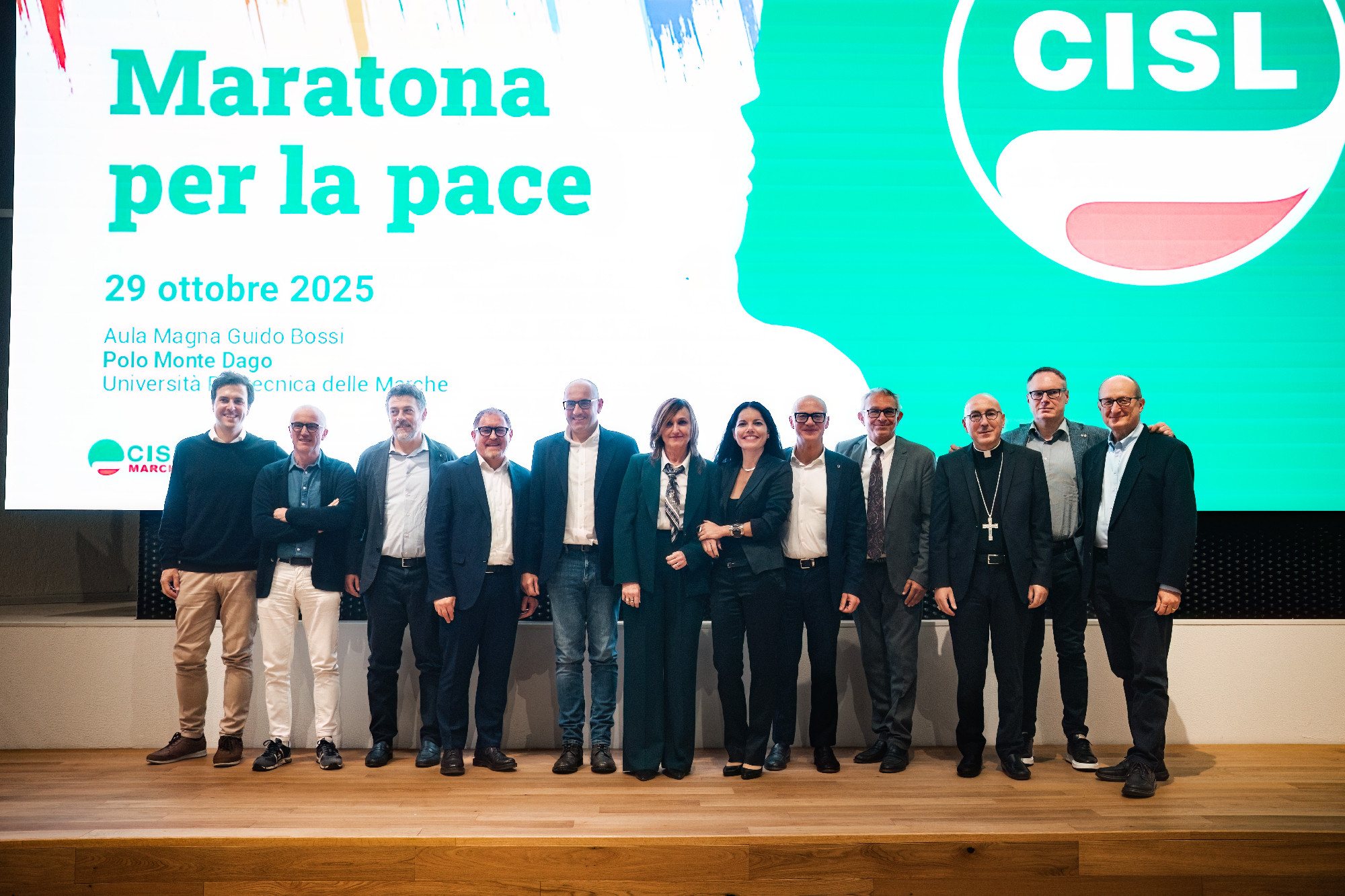 «La tappa marchigiana di oggi della Maratona per la Pace non è soltanto un evento: è un cammino che scegliamo di intraprendere insieme, passo dopo passo, intrecciando speranza e responsabilità. È l’avvio di un percorso fatto di gesti tangibili, come la campagna “Sos Gaza” capace di trasformare la solidarietà in azione, e l’indignazione in cura»: con queste parole il Segretario generale di Cisl Marche Marco Ferracuti ha aperto, nell’Aula Magna “G.Bossi” dell’Università Politecnica delle Marche l’iniziativa Cisl per la pace. Gremita, settecento i posti in sala, e a colori l’Aula Magna dell’Ateneo, volti di studenti e di lavoratori, bandiere, uniti per testimoniare la volontà di pace.