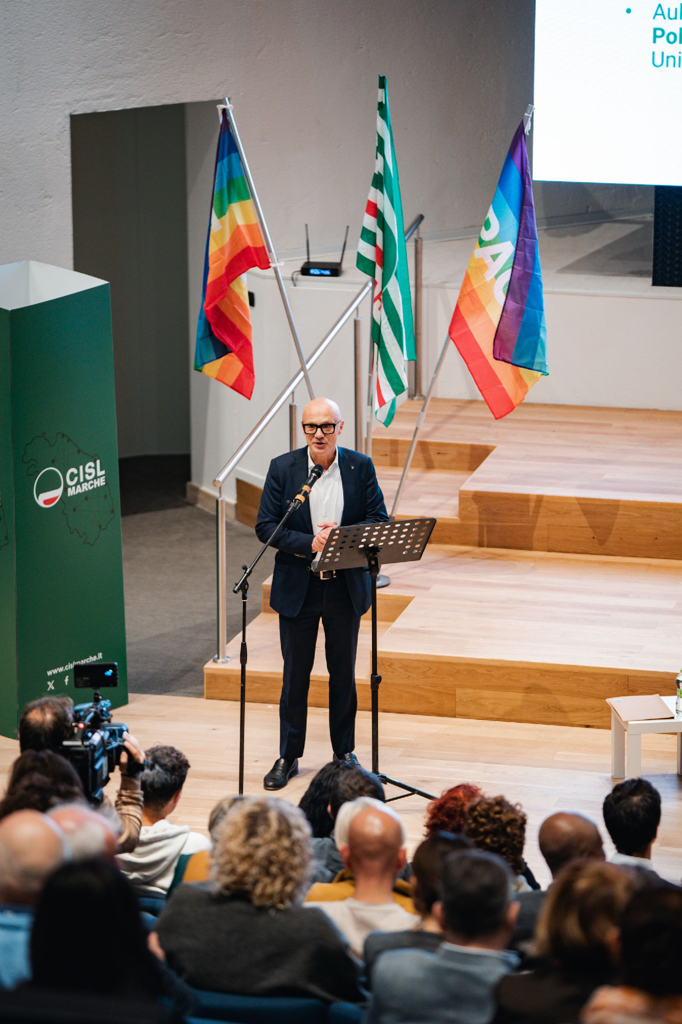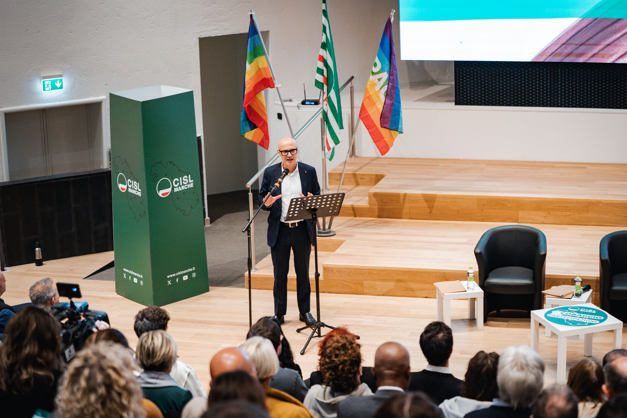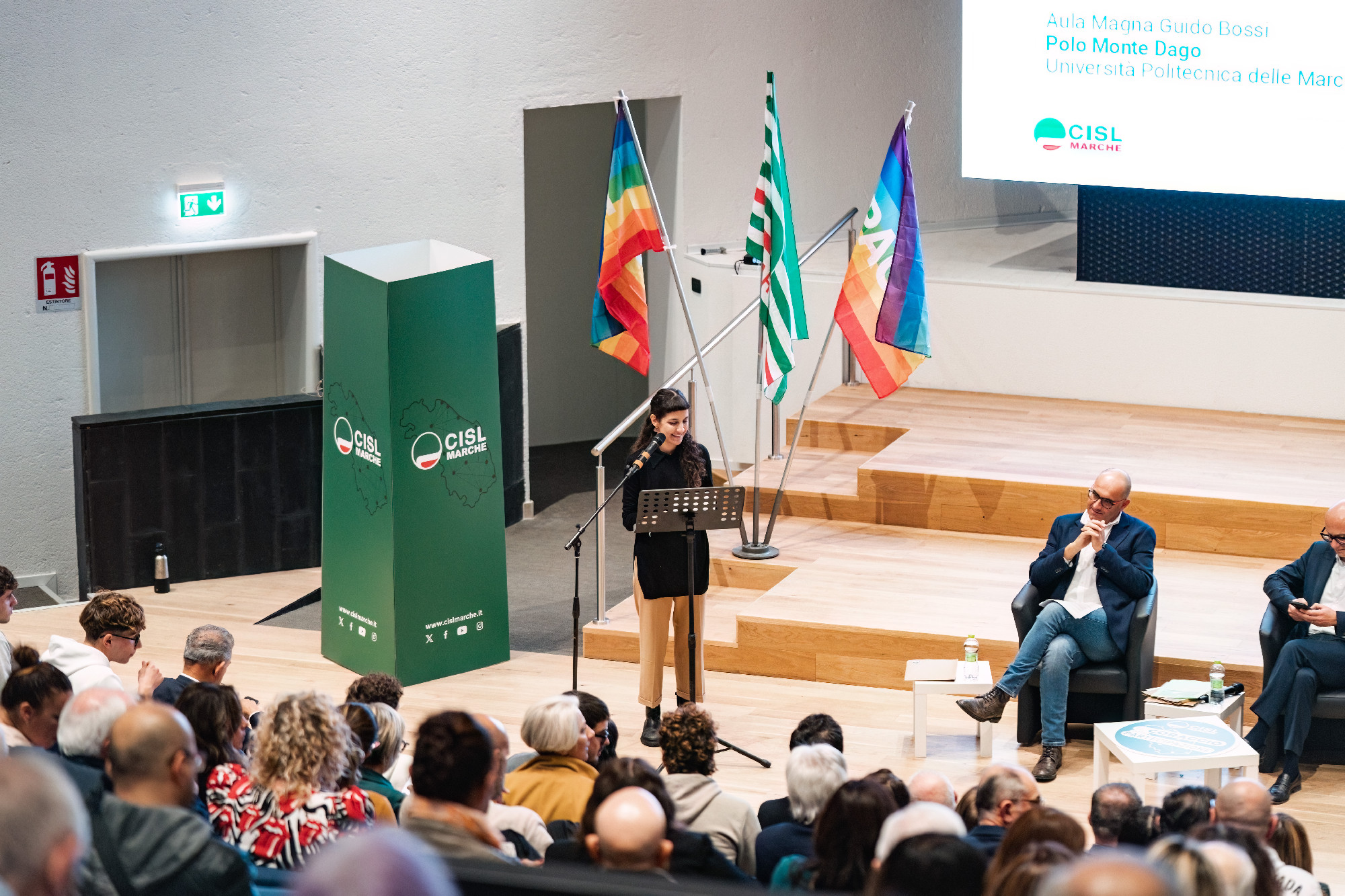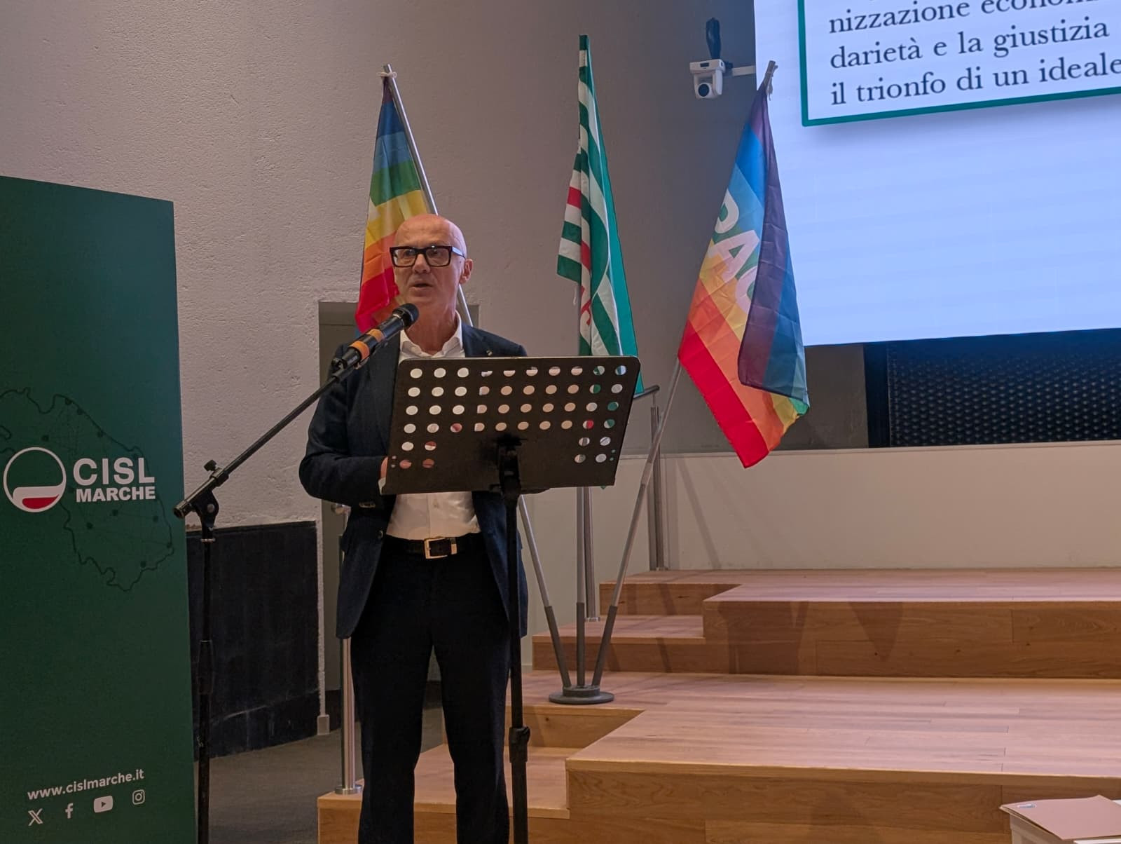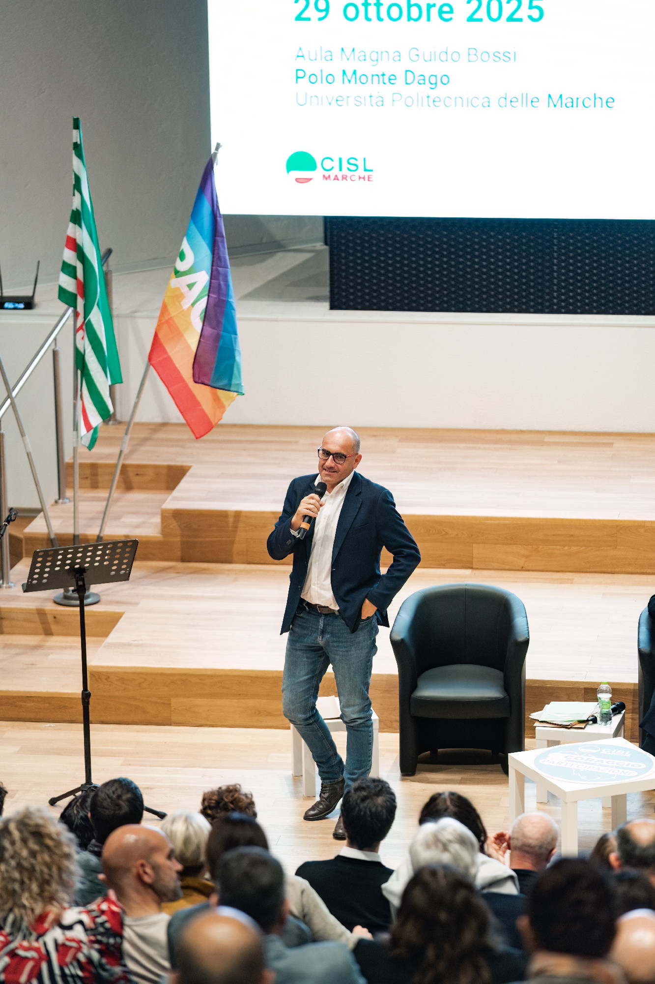 «La tappa marchigiana di oggi della Maratona per la Pace non è soltanto un evento: è un cammino che scegliamo di intraprendere insieme, passo dopo passo, intrecciando speranza e responsabilità. È l’avvio di un percorso fatto di gesti tangibili, come la campagna “Sos Gaza” capace di trasformare la solidarietà in azione, e l’indignazione in cura»: con queste parole il Segretario generale di Cisl Marche Marco Ferracuti ha aperto, nell’Aula Magna “G.Bossi” dell’Università Politecnica delle Marche l’iniziativa Cisl per la pace. Gremita, settecento i posti in sala, e a colori l’Aula Magna dell’Ateneo, volti di studenti e di lavoratori, bandiere, uniti per testimoniare la volontà di pace.
