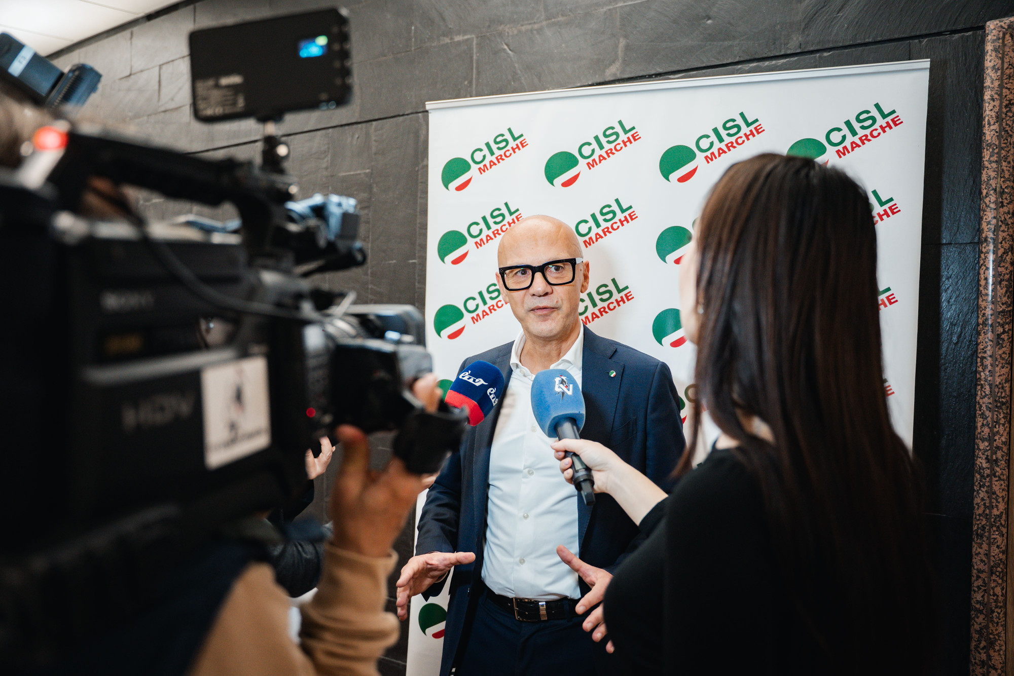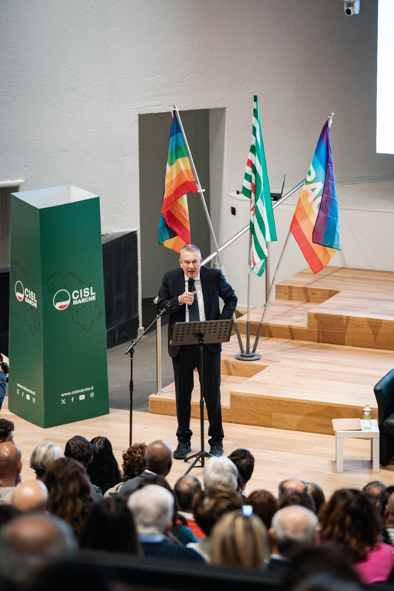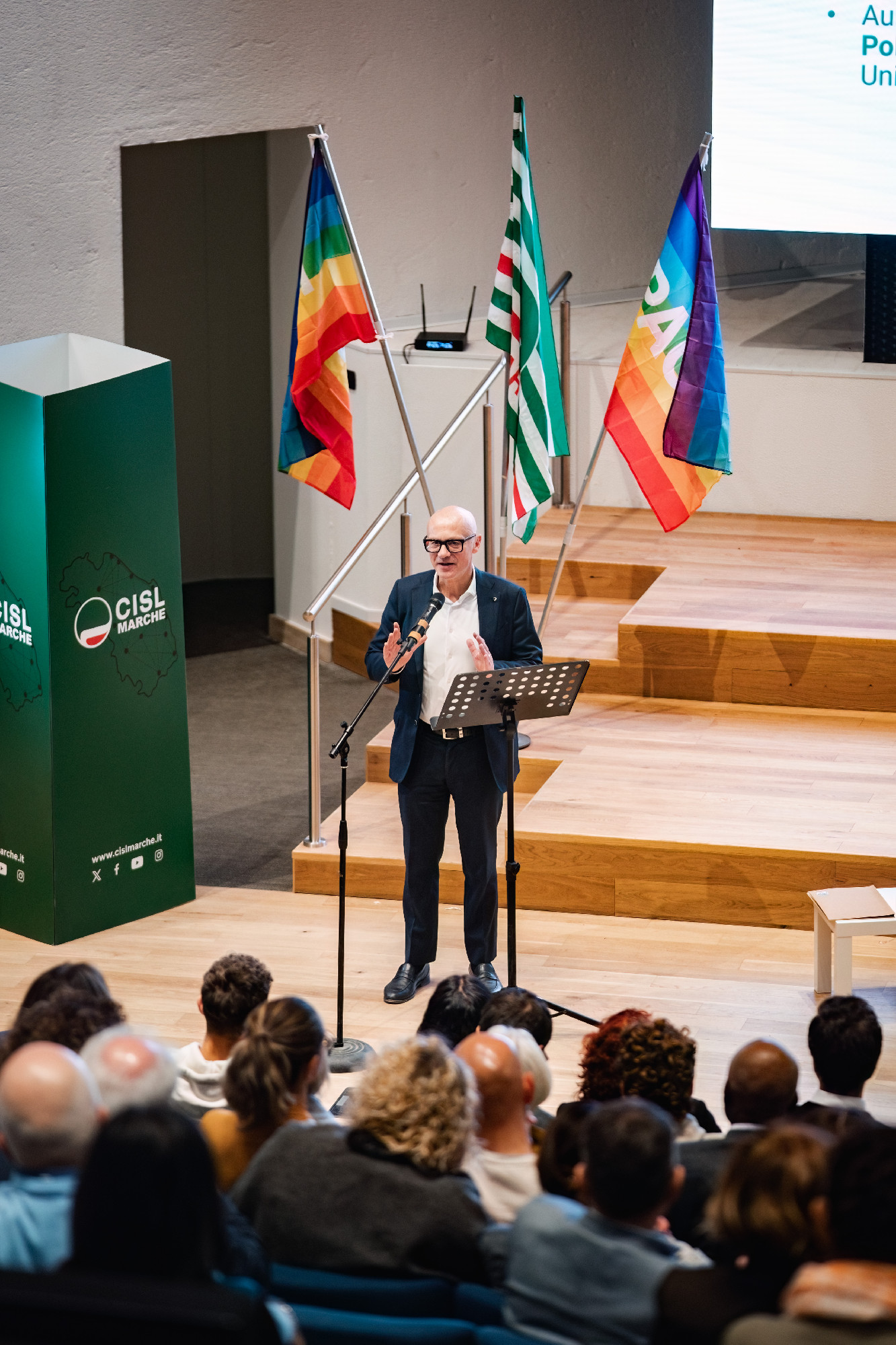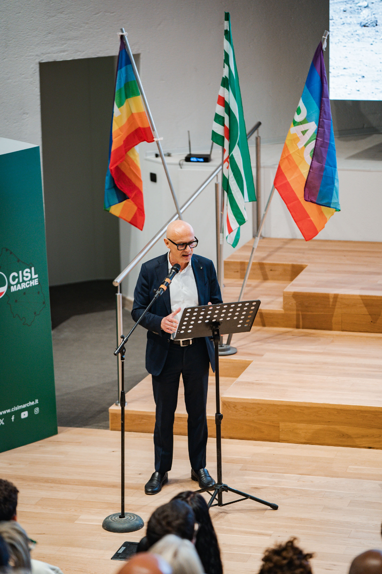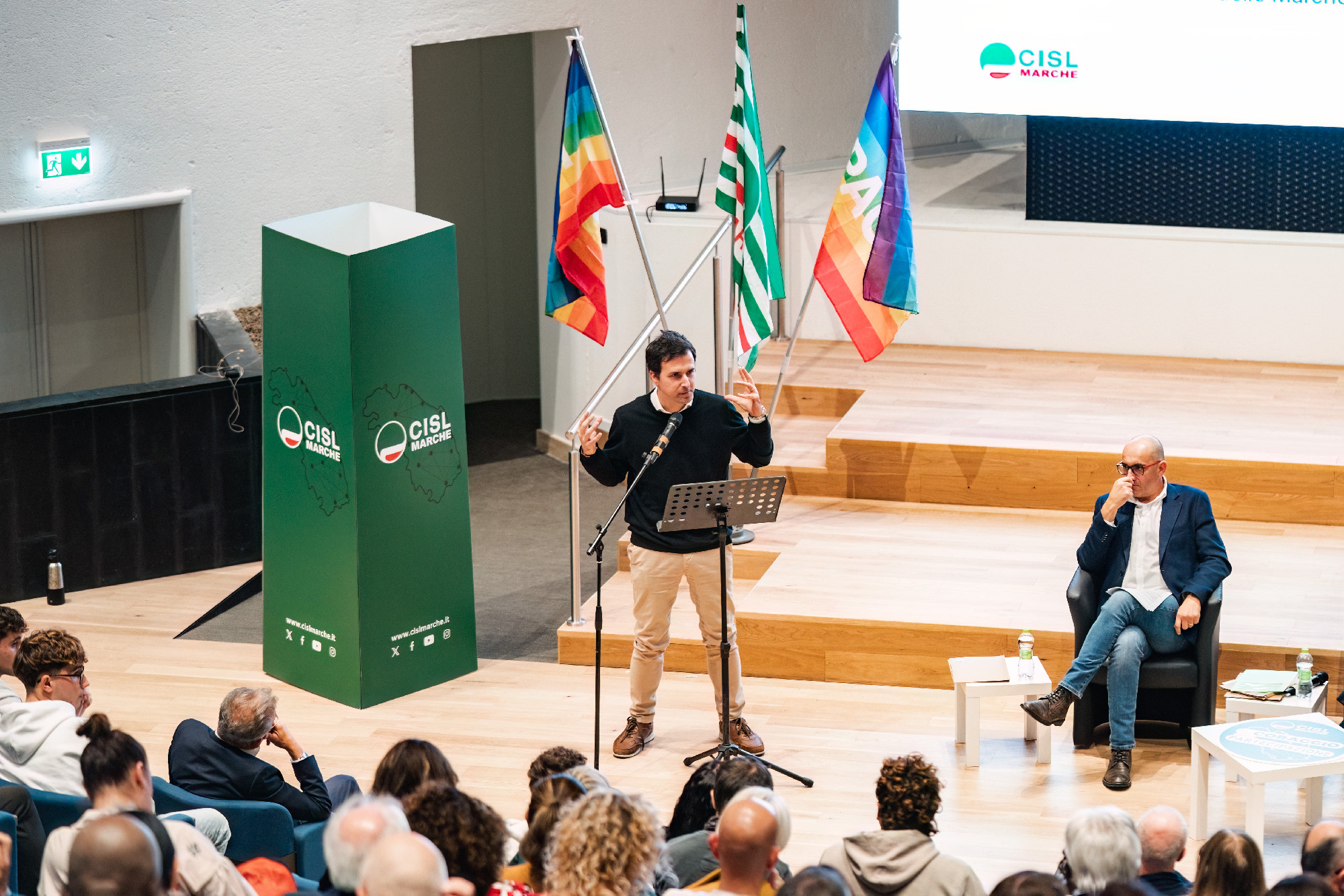 «La tappa marchigiana di oggi della Maratona per la Pace non è soltanto un evento: è un cammino che scegliamo di intraprendere insieme, passo dopo passo, intrecciando speranza e responsabilità. È l’avvio di un percorso fatto di gesti tangibili, come la campagna “Sos Gaza” capace di trasformare la solidarietà in azione, e l’indignazione in cura»: con queste parole il Segretario generale di Cisl Marche Marco Ferracuti ha aperto, nell’Aula Magna “G.Bossi” dell’Università Politecnica delle Marche l’iniziativa Cisl per la pace. Gremita, settecento i posti in sala, e a colori l’Aula Magna dell’Ateneo, volti di studenti e di lavoratori, bandiere, uniti per testimoniare la volontà di pace.