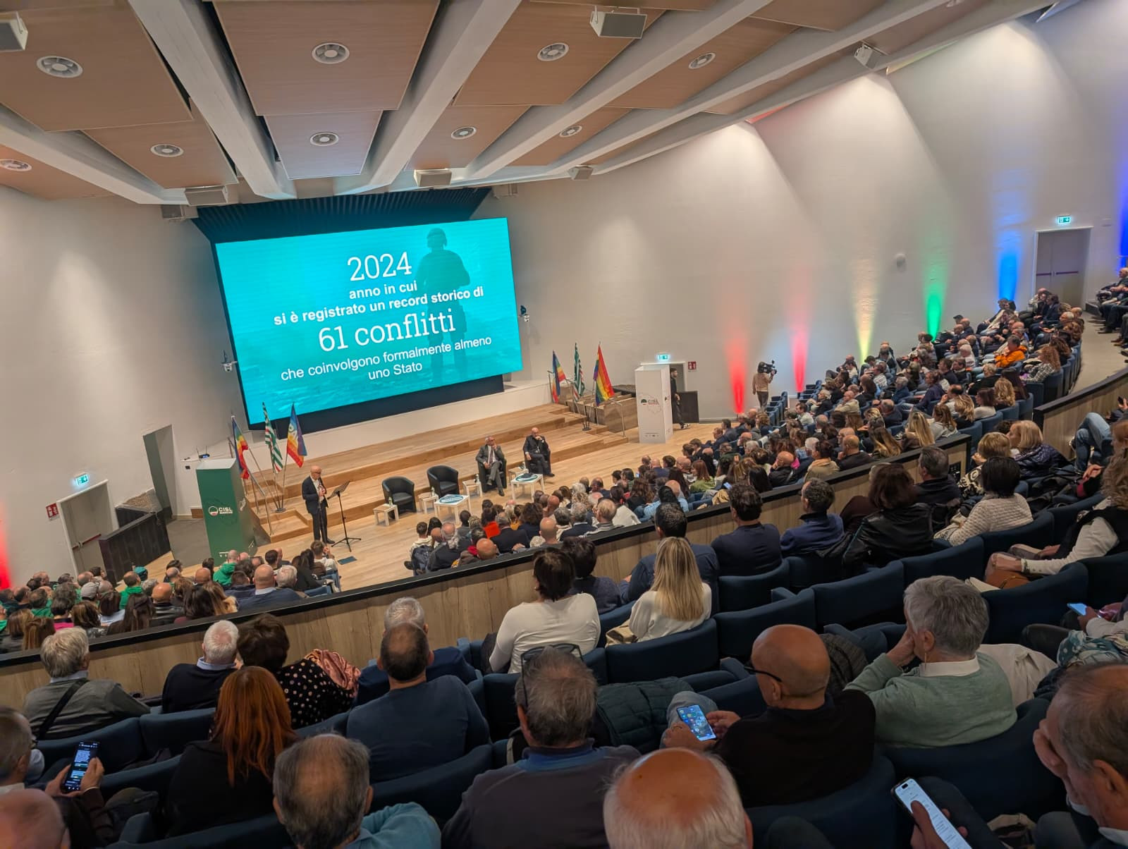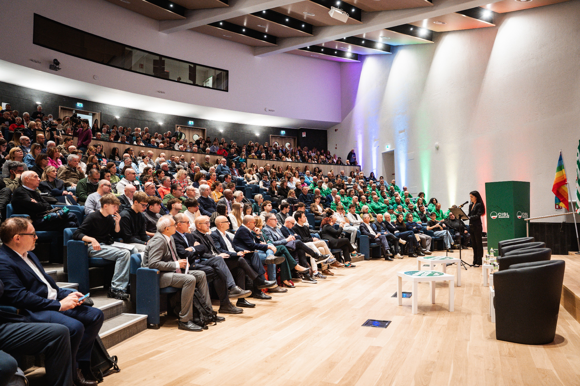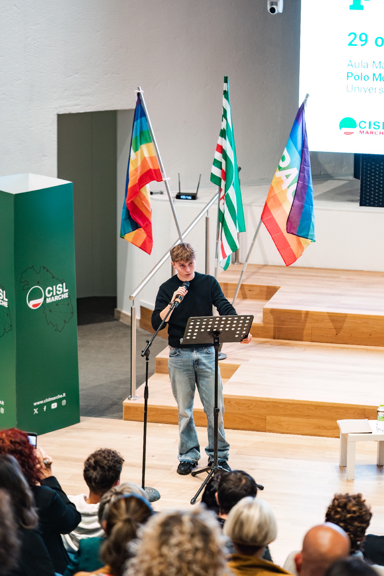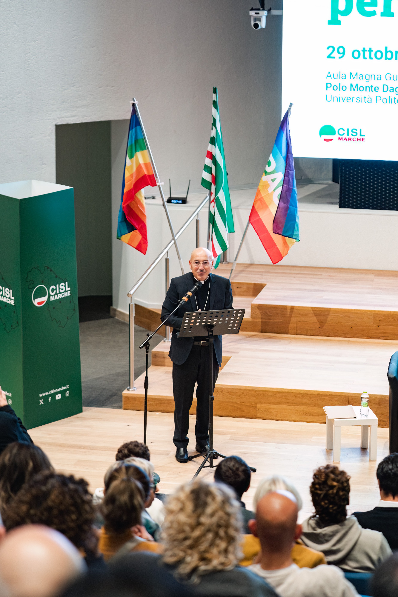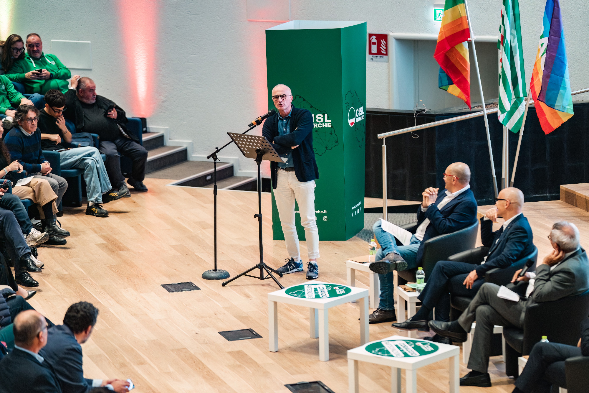 «La tappa marchigiana di oggi della Maratona per la Pace non è soltanto un evento: è un cammino che scegliamo di intraprendere insieme, passo dopo passo, intrecciando speranza e responsabilità. È l’avvio di un percorso fatto di gesti tangibili, come la campagna “Sos Gaza” capace di trasformare la solidarietà in azione, e l’indignazione in cura»: con queste parole il Segretario generale di Cisl Marche Marco Ferracuti ha aperto, nell’Aula Magna “G.Bossi” dell’Università Politecnica delle Marche l’iniziativa Cisl per la pace. Gremita, settecento i posti in sala, e a colori l’Aula Magna dell’Ateneo, volti di studenti e di lavoratori, bandiere, uniti per testimoniare la volontà di pace.