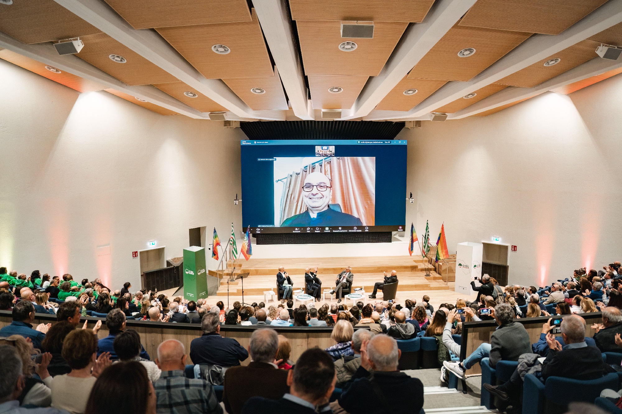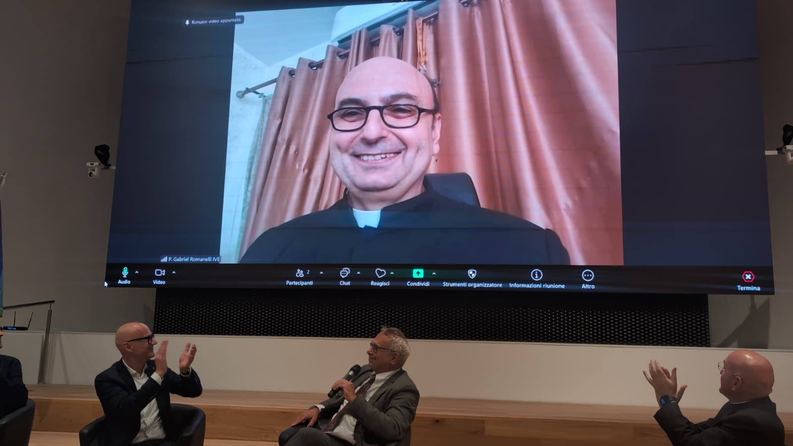 Da Gaza la testimonianza in diretta di Padre Gabriel Romanelli, parroco della chiesa della Sacra Famiglia: «Le città della Striscia sono state “tritate”, quella che è rimasta più in piedi è Gaza City ma non c’è un palazzo che non abbia ricevuto un colpo, non c’è una casa dove non si pianga un morto. La tregua dicono che regge, non abbiamo i bombardamenti forti ma da ieri ad oggi abbiamo avuto 94 morti. Entrano pochissimi aiuti umanitari. Chi può aiutare anche economicamente lo faccia, bisogna essere generosi e pensare al bene degli altri». Standing ovation finale per Padre Gabriel.