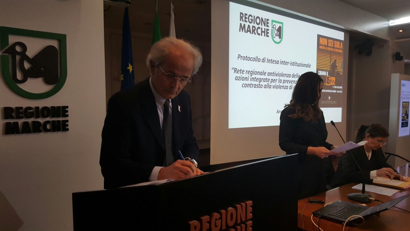 Prevenire e contrastare la violenza di genere puntando sulla collaborazione di 65 enti istituzionali marchigiani. È quanto prevede il protocollo d’intesa che è stato sottoscritto, in Regione, dall’assessora alle Pari opportunità, Manuela Bora, presidente del Forum permanente contro le molestie e le violenza di genere, insieme a rappresentanti Anci, Uncem, Comuni capofila degli Ambiti territoriali sociali, Preture,Procura Generale della Repubblica, Corte di appello delle Marche e Magistrature, Carabinieri, Polizia di Stato, Asur Marche, Ufficio scolastico regionale, organizzazioni sindacali e datoriali, Commissione regionale pari opportunità, Ombudsman Marche, Corecom Marche, Collegio degli infermieri e gli Ordine dei medici, degli psicologi, degli assistenti sociali, degli avvocati, dei giornalisti.