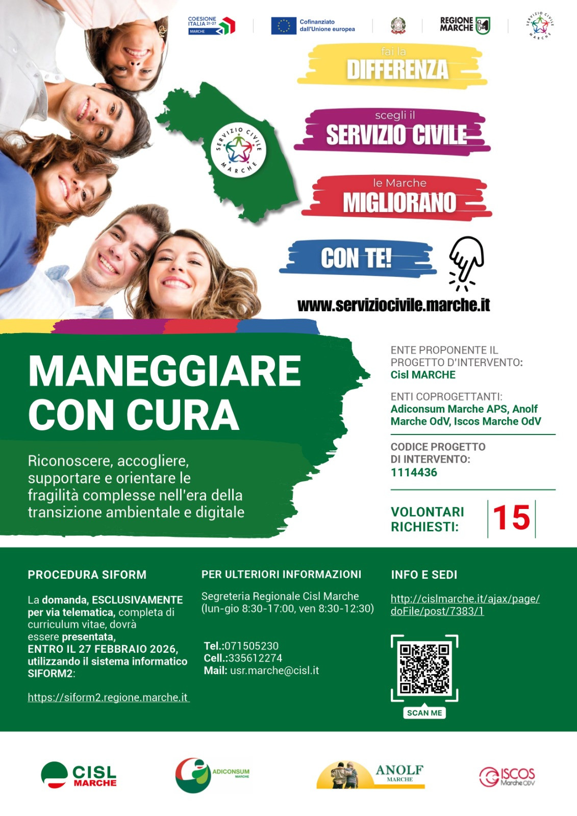 Tra i progetti approvati dalla Regione Marche, previsti dal nuovo bando per il Servizio civile regionale, c’è il progetto “Maneggiare con cura. Riconoscere, accogliere, supportare e orientare le fragilità complesse nell’era della transizione ambientale e digitale” promosso da CISL Marche Adiconsum Marche APS, Anolf Marche OdV, Iscos Marche OdV, riservato a 15 giovani disoccupati o inattivi, con l'obiettivo di rispondere in modo più efficace e integrato ai bisogni della comunità marchigiana.